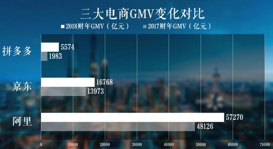 最新财报数据显示,阿里巴巴GMV为5.727万亿元,同比增长19%。而截至2019年3月,拼多多最近12个月的滚动GMV为5574亿元,是阿里的十分之一,但同比增长却高达181%。