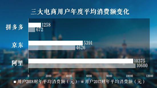 2018财年(阿里的财年从2018年一季度算起到2019年一季度),全国人民在天猫、淘宝上消费了10375元,是拼多多用户年度平均消费额的9倍多,也是京东用户的1.9倍。