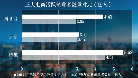 淘宝、天猫的年活跃消费者为5.52亿,作为对比,拼多多的年活跃买家从2.95亿增长到了4.43亿,同比增长50%。京东的表现是最差的,过去12个月的活跃用户数为3.105亿,同比仅增长2.88%。